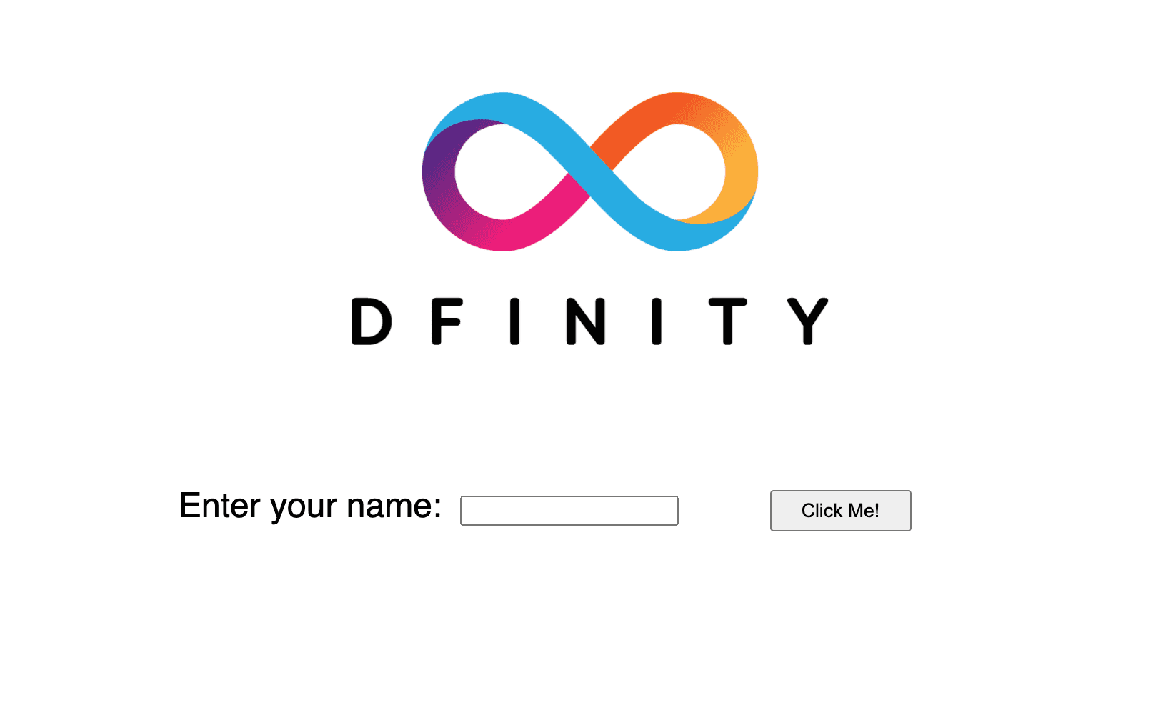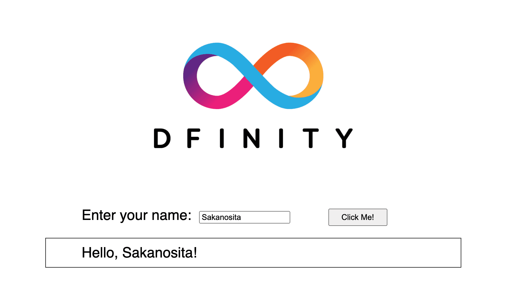 名前をいれてクリックしてみましょう、先程ローカルの IC にデプロイしたキャニスターを実行して結果をブラウザで表示します。