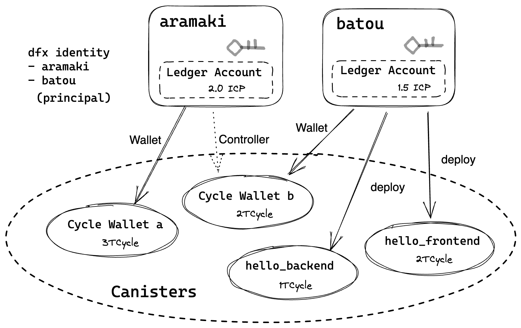 dfx identity ごとにウォレットを作成したり削除したりできます。 ウォレットごとに複数の Principal を contorller として追加でき、Controller となった Principal はそのウォレットの Cycle を利用したり、ウォレットを削除したりできます。