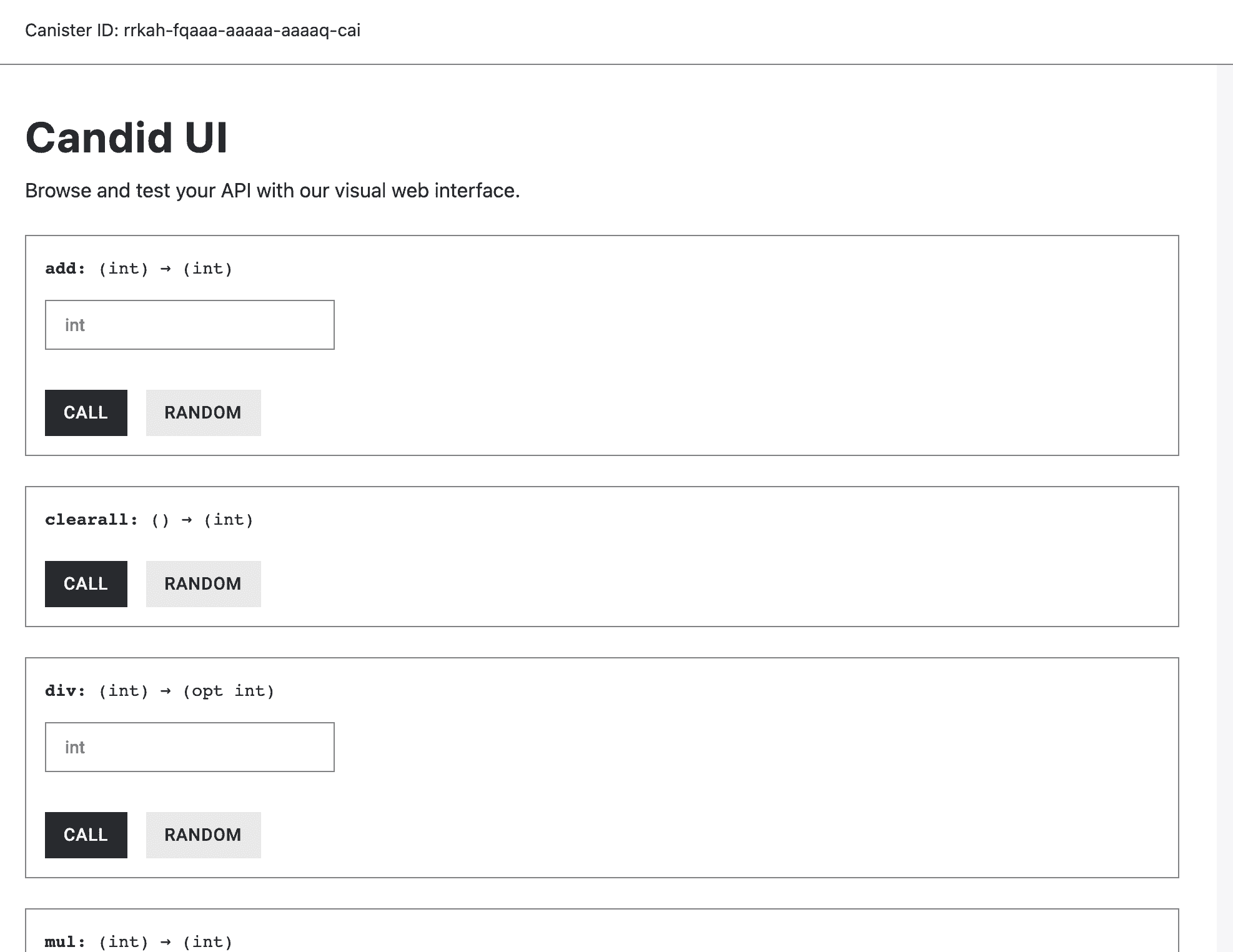 http://127.0.0.1:8000/?canisterId=<CANDID-UI-CANISTER-IDENTIFIER>http://127.0.0.1:8000/?canisterId=r7inp-6aaaa-aaaaa-aaabq-caicalcキャニスターの ID を取得して、ブラウザのProvide a canister IDに入力します。