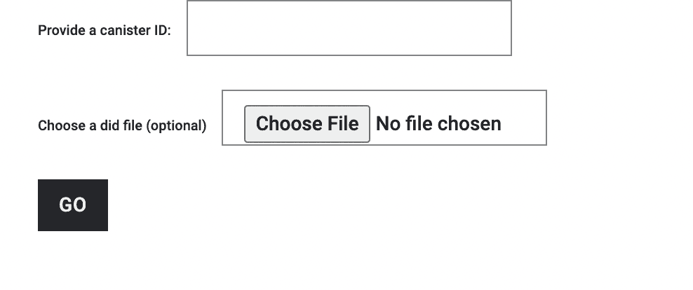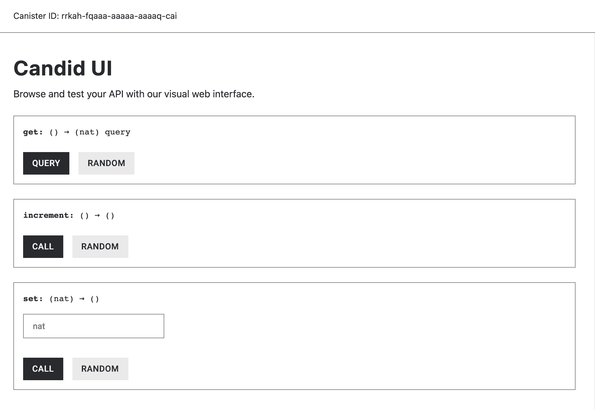 my_counter % dfx canister id my_counterrrkah-fqaaa-aaaaa-aaaaq-caiこの ID をブラウザのフォームのProvide a canister ID:に入力します。