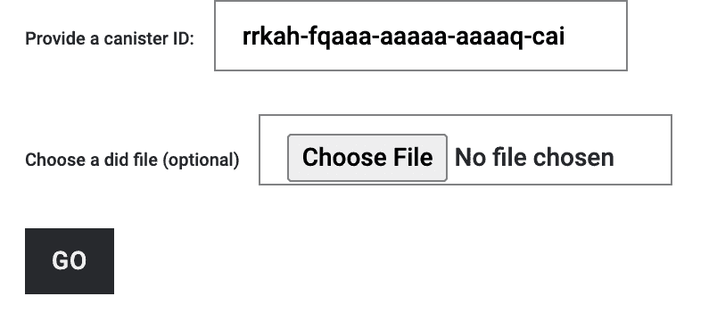 rrkah-fqaaa-aaaaa-aaaaq-cai以下のように Canister ID を入力する画面が表示されるはずです。