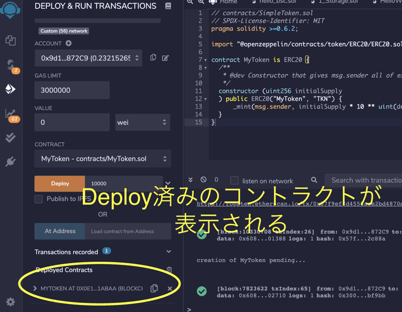 スマートコントラクトは、ウォレットと同じようにブロックチェーン上のアドレスを持っています。そのアドレスは DEPLOY & RUN TRANSACTION 画面の左下からコピーできます。
